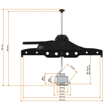 Sa structure est faite d'un composite spécial de matière plastique renforcée (PA avec fibre de verre) qui lui confère un mélange de rigidité pour une sécurité totale (crash test) et de flexibilité afin de ne pas endommager les échelles lors du chargement et du transport.